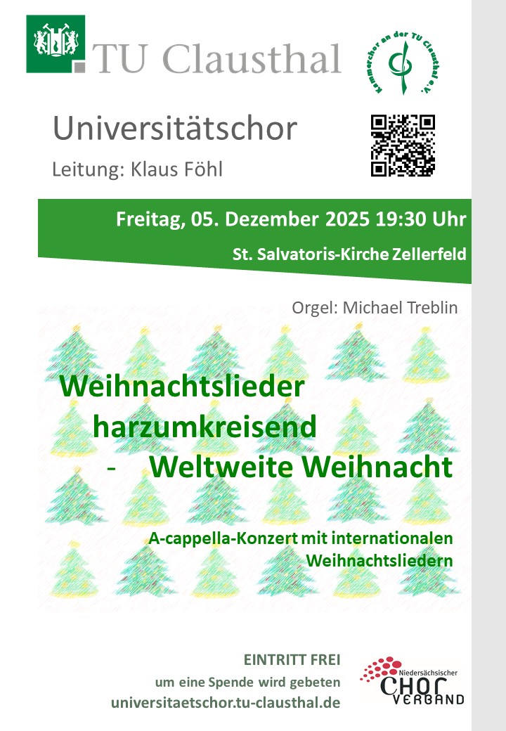 Der Universitätschor Clausthal sucht zum 1. Januar 2026 eine neue Chorleitung. Nähere Informationen erhalten Sie hier.